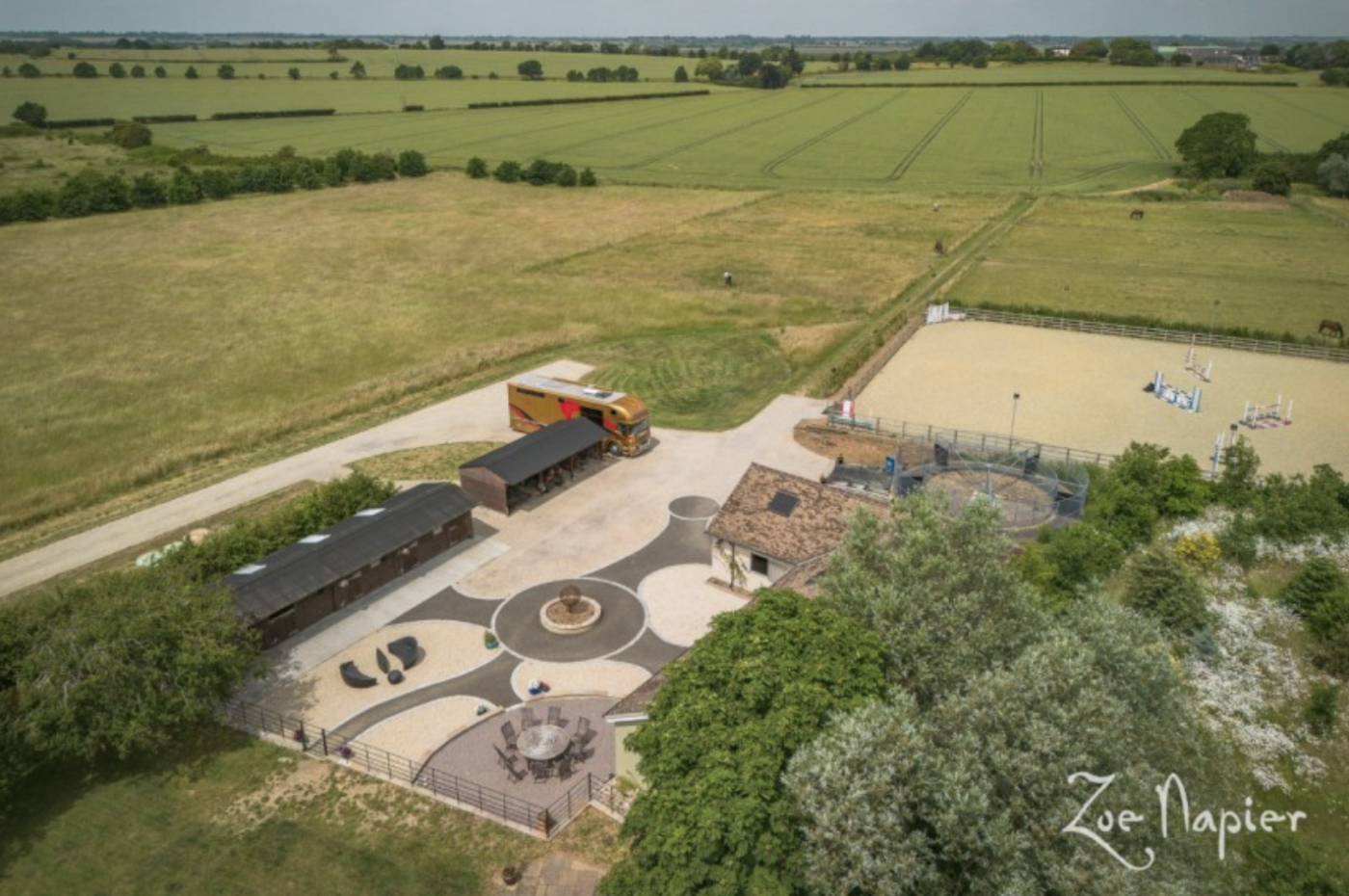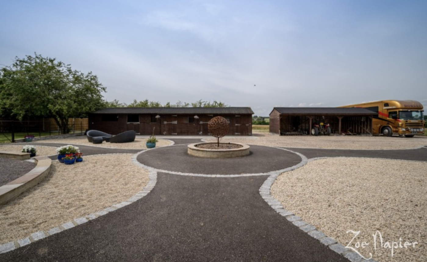 At the end of the garden, park fencing and a metal gate marks the start of the equestrian facilities. Tarmac paths edged with granite lead to different areas of the yard, social spaces with table and chairs and a lounge area.