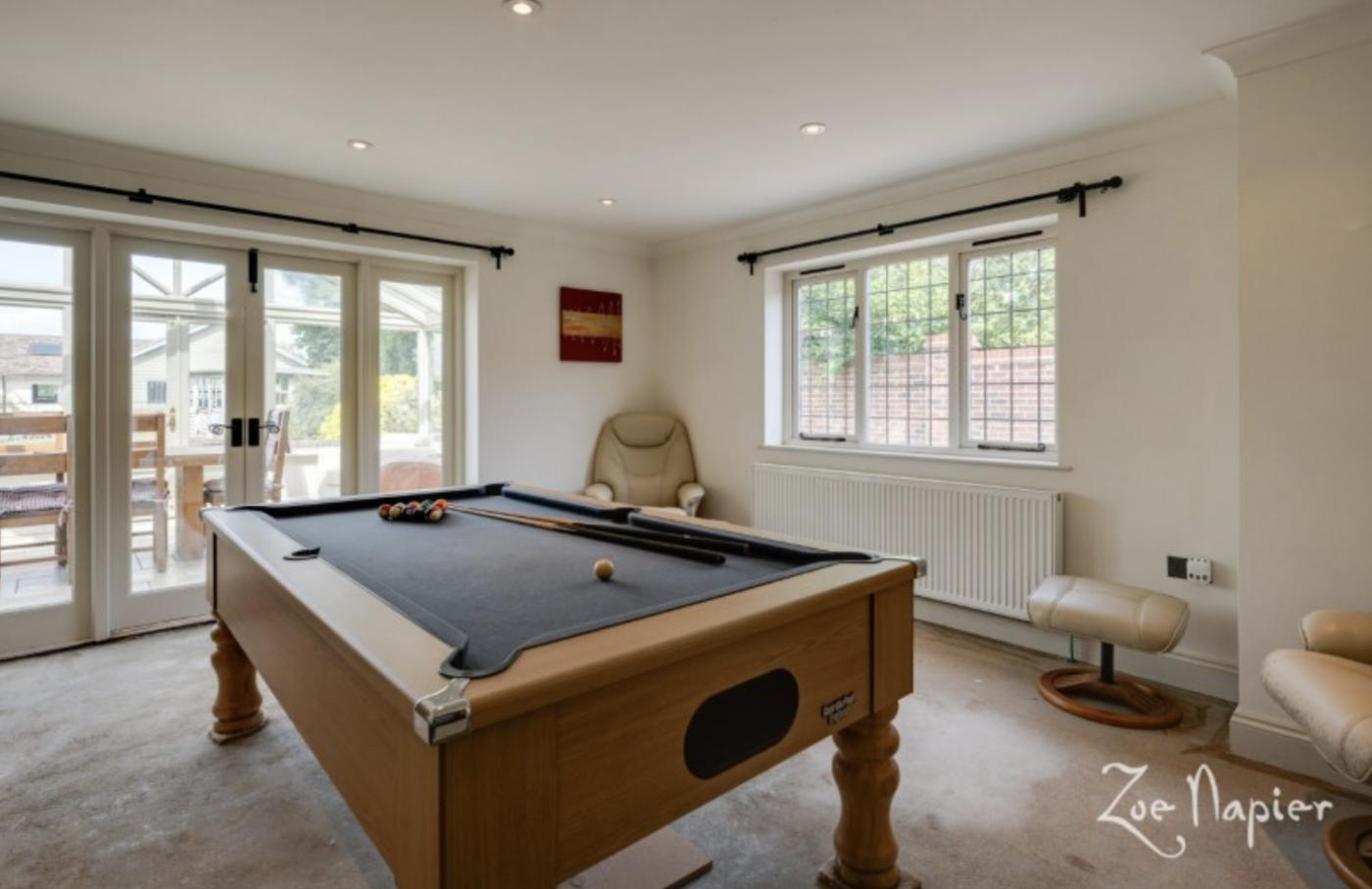 In the middle of the cottage is a further sitting room, while glass double doors from the hall lead you into the dining room, which is currently used as a pool room. There is also a conservatory with underfloor heating and air conditioning units, and two double doors to the garden.