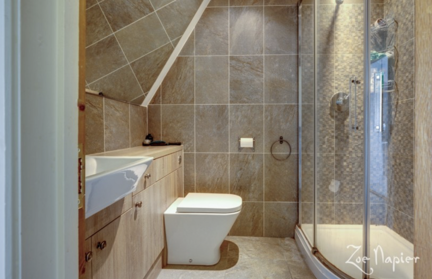 The first bathroom has a heritage-style suite with bath, sink and toilet. The shower room, further along the hall, has a modern suite and a corner shower. The two bedrooms at the rear have views to the stables and paddocks, with fitted wardrobes to both and an en-suite to one.