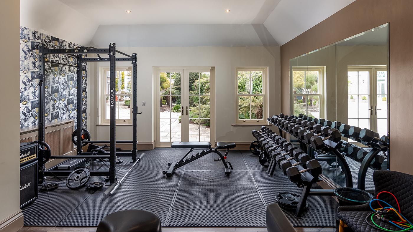 A recent extension houses a gym with full length wall mirrors and changing rooms that opens to the indoor swimming pool and sauna.