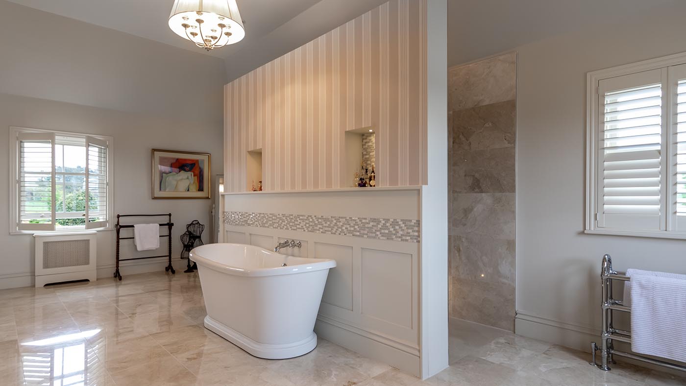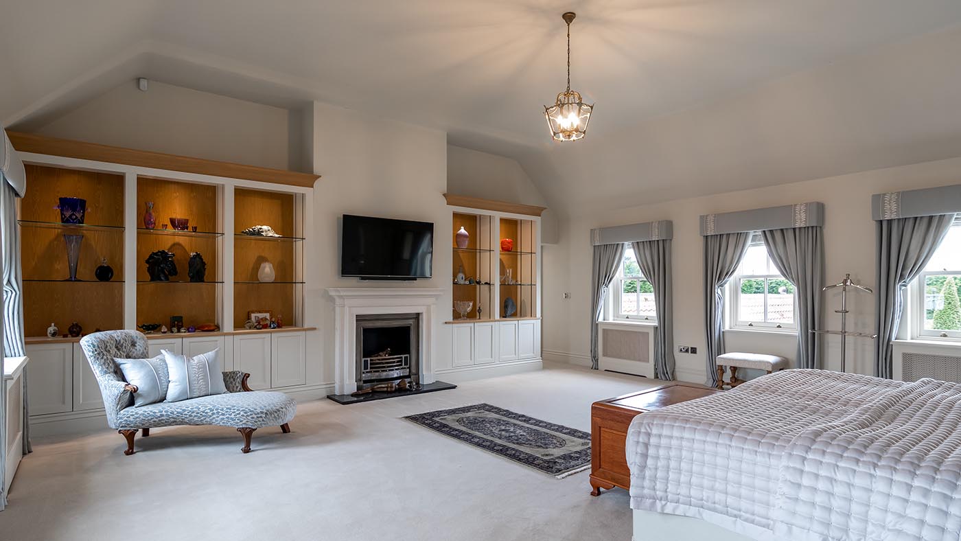 A minstrel gallery leads to four large bedrooms in the main house, three of which are en-suite. The main suite comes with two dressing rooms and a large en-suite bathroom with marble floor, bath, shower and twin washbasins.