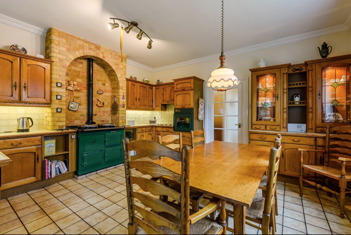 The traditional country-style kitchen has an AGA as well as tiled flooring.