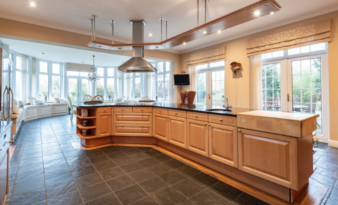 The kitchen/breakfast room extends into an oval shaped breakfast area with three quarter height continuous windows and French doors onto the terrace.