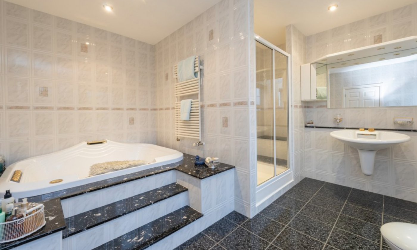 The bedrooms are arranged over two floors and include a master suite with glazed double doors opening onto a balcony with panoramic views; there is also a dressing room and a large en-suite bathroom with a raised sunken bath and shower cubicle.
