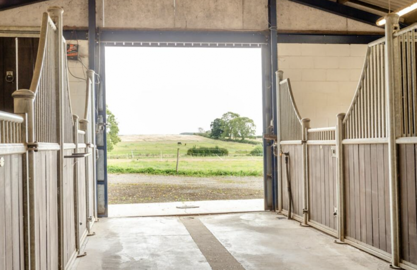 A wide hard core track leads past the house to outbuildings which comprise an open-fronted steel framed tractor shed, a concrete framed open-fronted barn and steel framed American barn, with 10 Monarch 12×12’ stables, including a tack room, wash bay and WC. PV solar panels are installed on the American barn roof and provide electricity for the house and outbuildings.