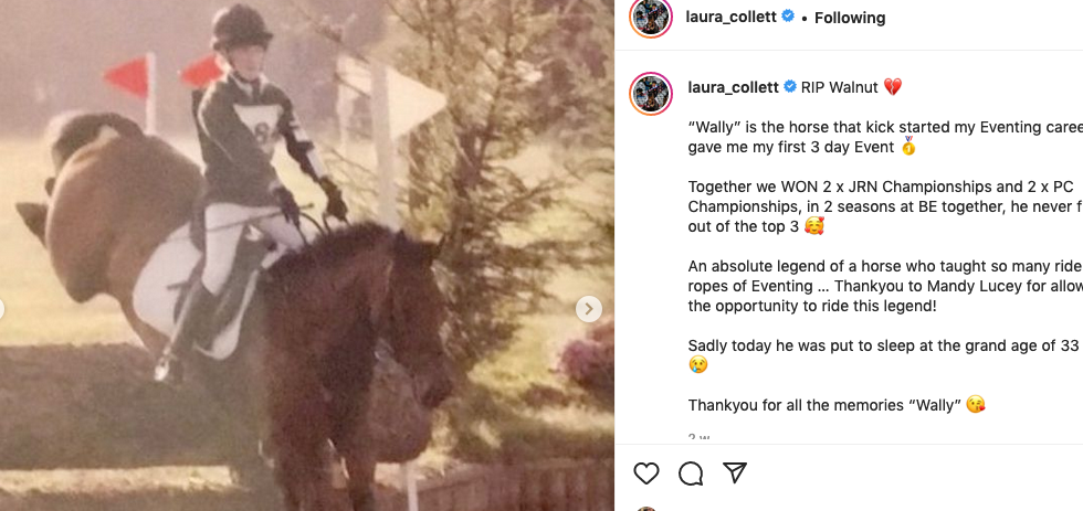 ”An absolute legend of a horse who taught so many riders the ropes of eventing – thank you for all the memories ‘Wally’,” said Laura.