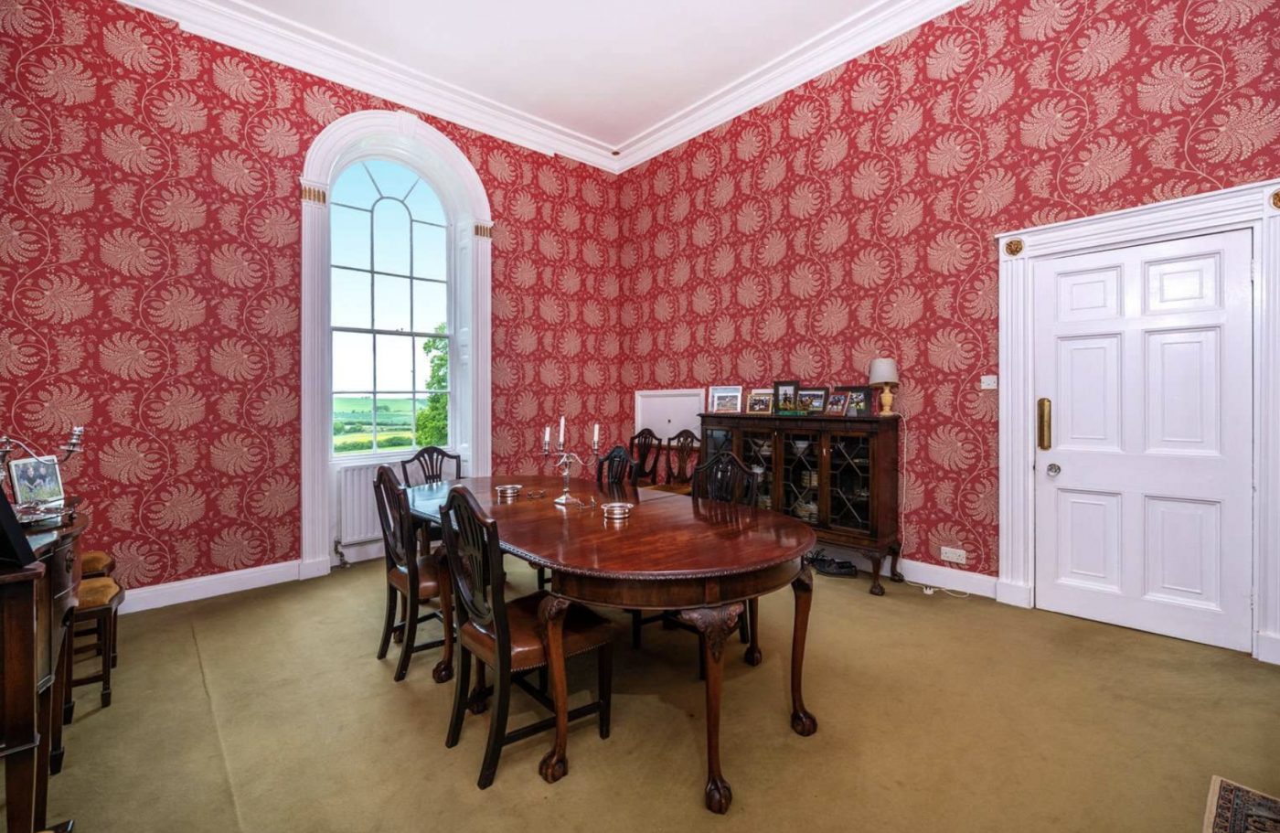 The house is entered through a pillared storm porch into the entrance hall. There is a large drawing room with sash windows and an open fireplace.
