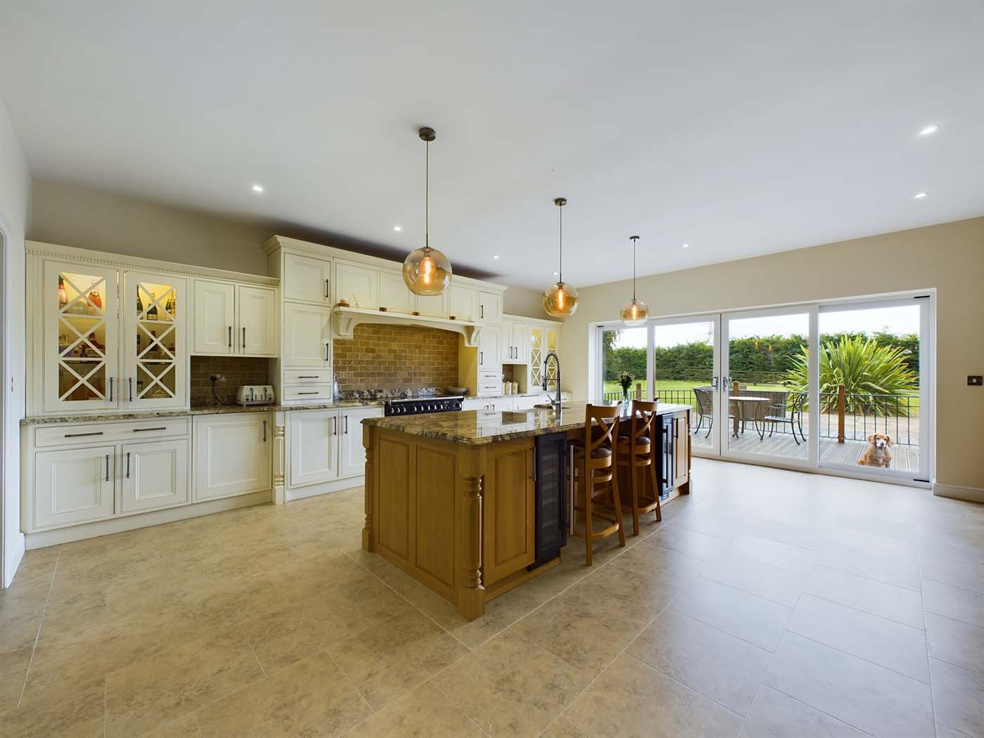 The kitchen and breakfast room, which offers a striking central island and marble flooring, can be opened up to the rear garden via a sliding glass door.