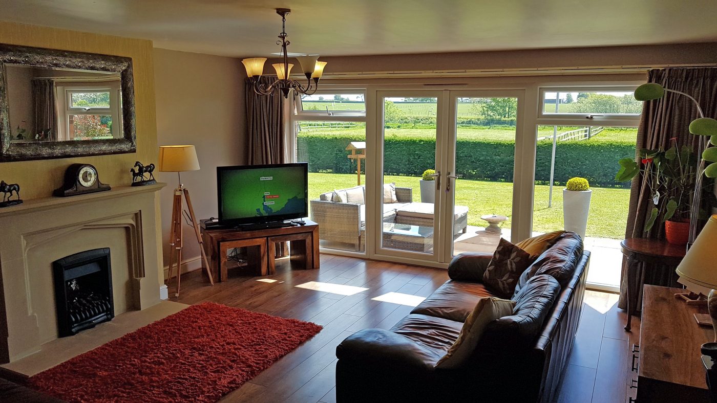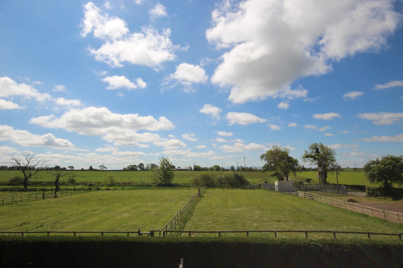 The house is a detached property surrounded by gardens which overlook the paddocks. Ground floor features include a kitchen, a dining room and a lounge with patio doors leading outside.
