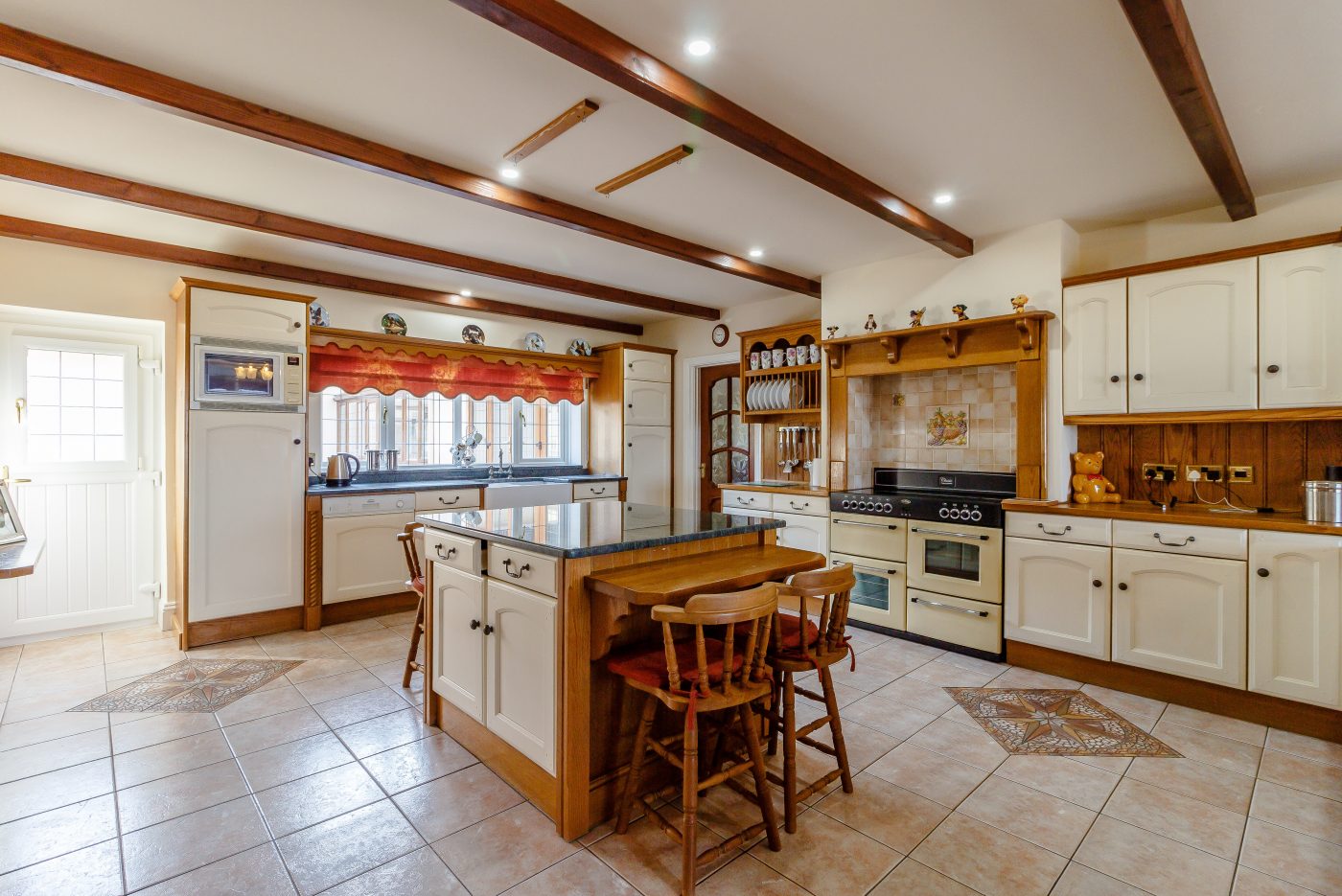 At the centre is a dual aspect kitchen with exposed ceiling beams, a central island and a door out to the courtyard.