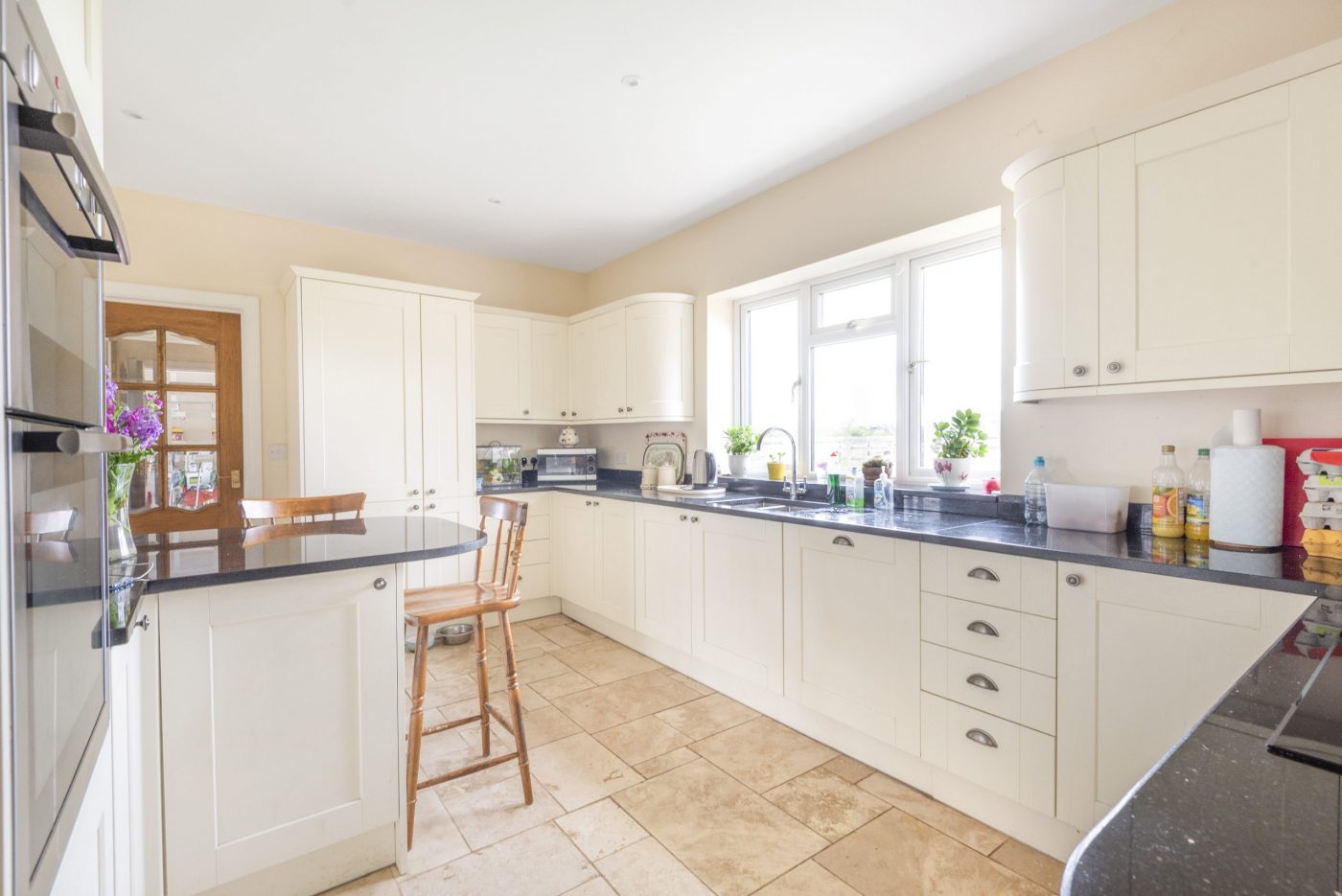 Inside, there is a well-appointed kitchen with granite work surfaces, wall and base units, built-in double oven, four-ring hob and extractor.