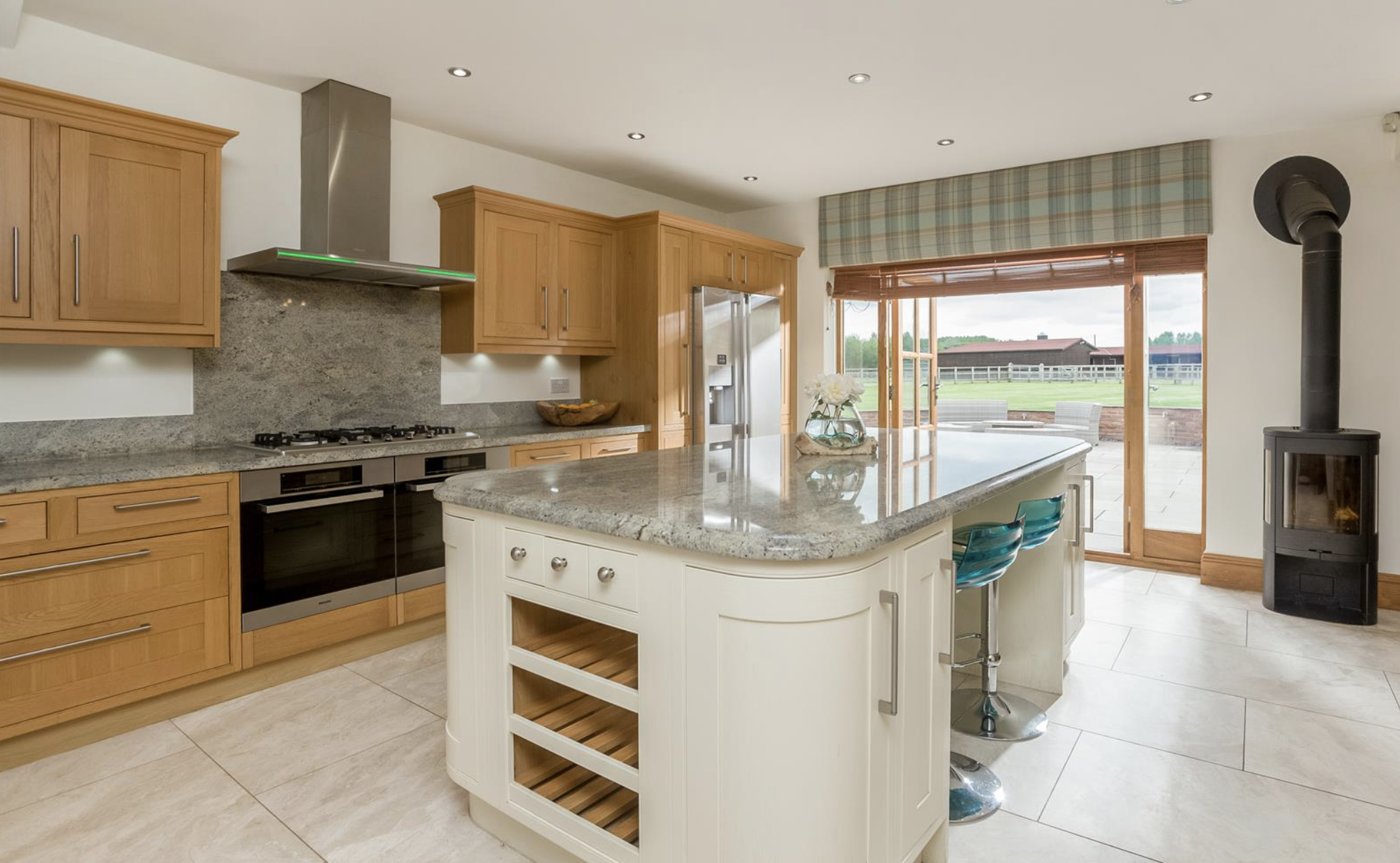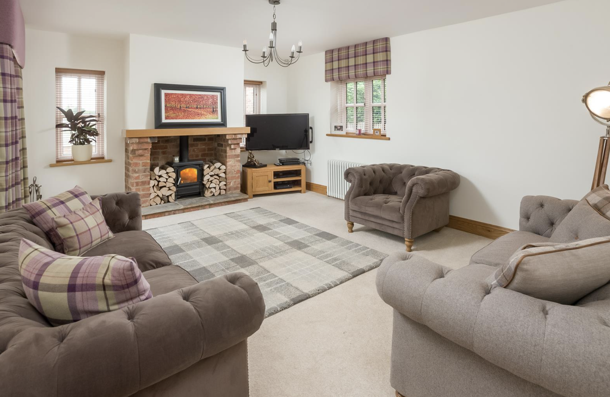 There is also a woodburning stove and French doors to the patios and gardens beyond, plus a sitting room with another wood burner and French doors to garden.