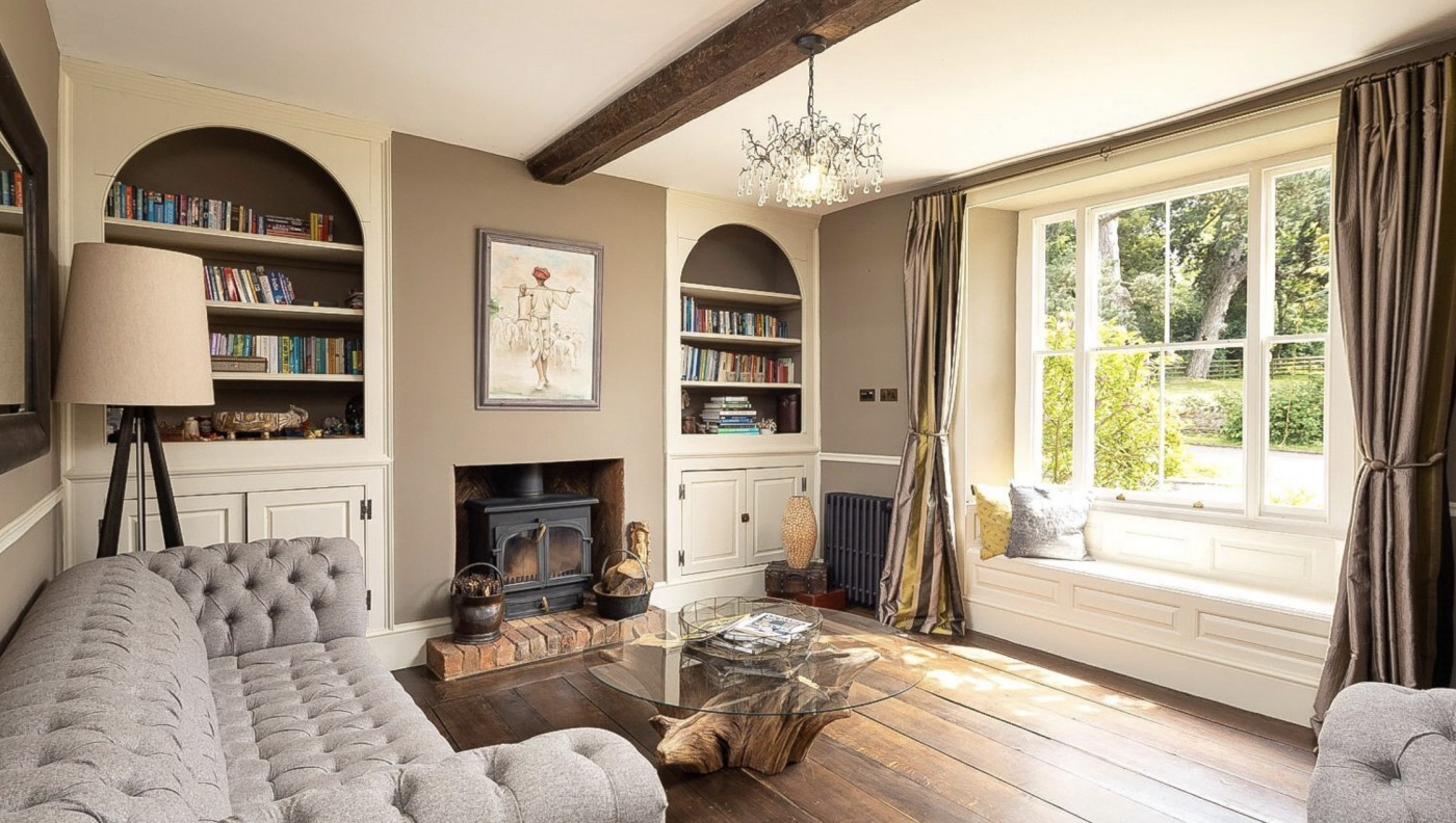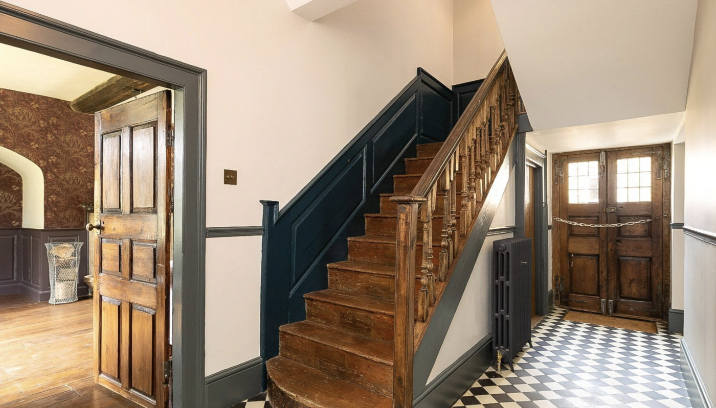 The front door of the main house opens into a tiled reception hall with an original wooden staircase. Off the hall are two reception rooms with exposed wooden floors and both have fireplaces housing wood burners along with window seats.