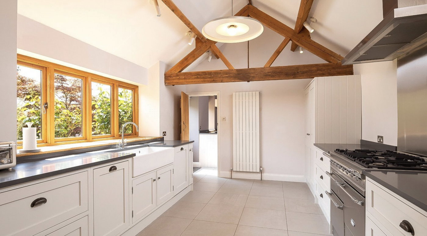 The kitchen/breakfast/family room has views over and direct access into the courtyard garden. The kitchen houses a bespoke shaker kitchen with Silestone surfaces, integrated appliances including a Lacanche range, Miele combination steam and microwave ovens, a Liebherr full height fridge, a Zip hot water tap and a separate drinks fridge. Limestone flooring runs throughout with electric underfloor heating with a family area set around an inglenook fireplace with a wood burner. There is also a utility room just off the kitchen.