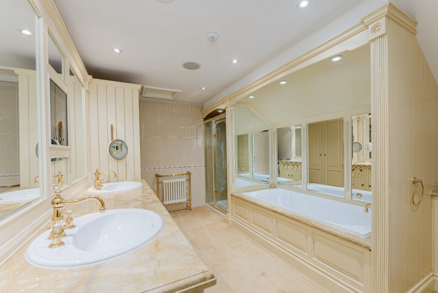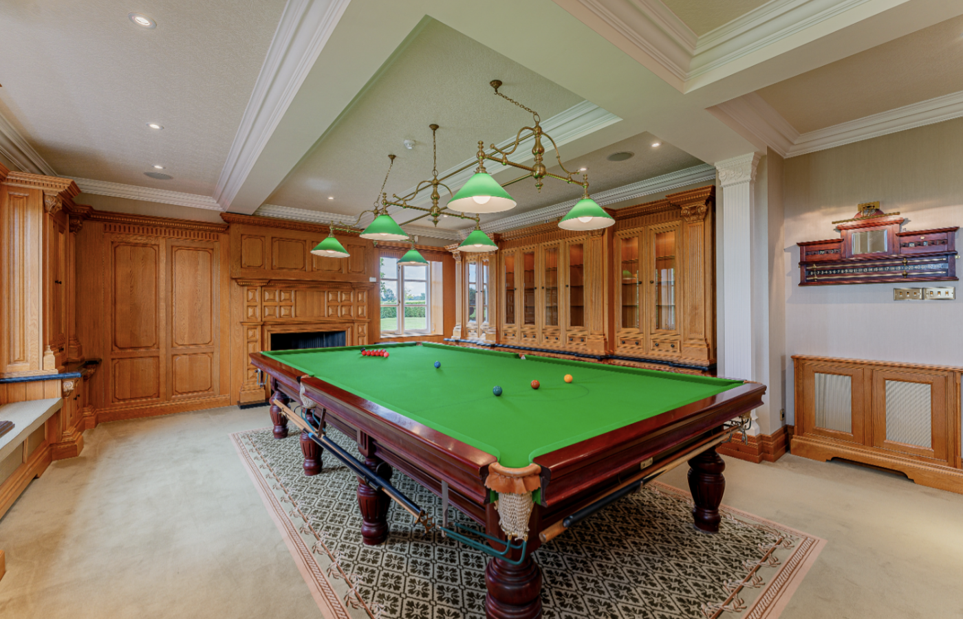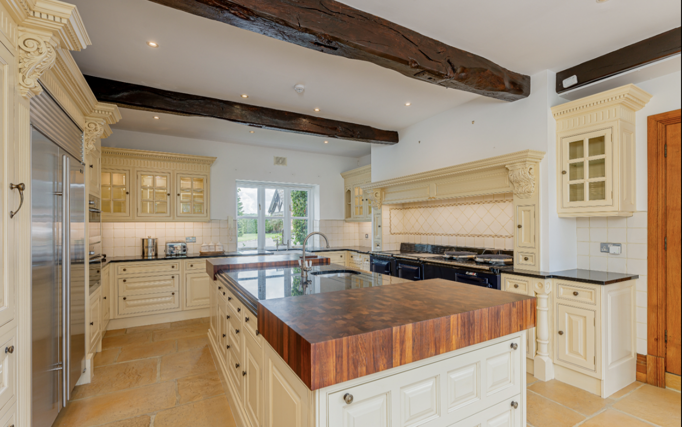 The ground floor has five reception rooms, one of which is currently used as a snooker room. There is also an entrance hall and kitchen with seating area. The kitchen is fitted with handmade bespoke Clive Christian units, a five-door Aga and a range of Miele appliances. Adjacent to the kitchen is a boot room and utility room. In addition, there is a cellar with wine racking in place.