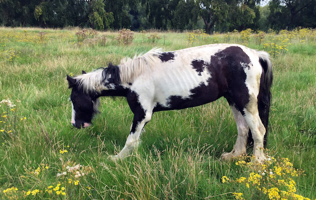 A member of the public called Redwings on 23 August to alert them to piebald cob Raggy, thought to be a four-year-old, who had been dumped on the derelict Passmores School site in Harlow, Essex.