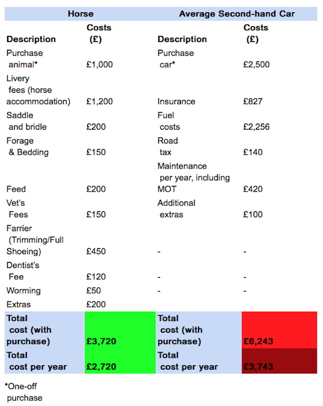 Racing website myracing.com has “crunched the numbers” and determined that it would be cheaper to “ditch the car” and commute on a horse instead.