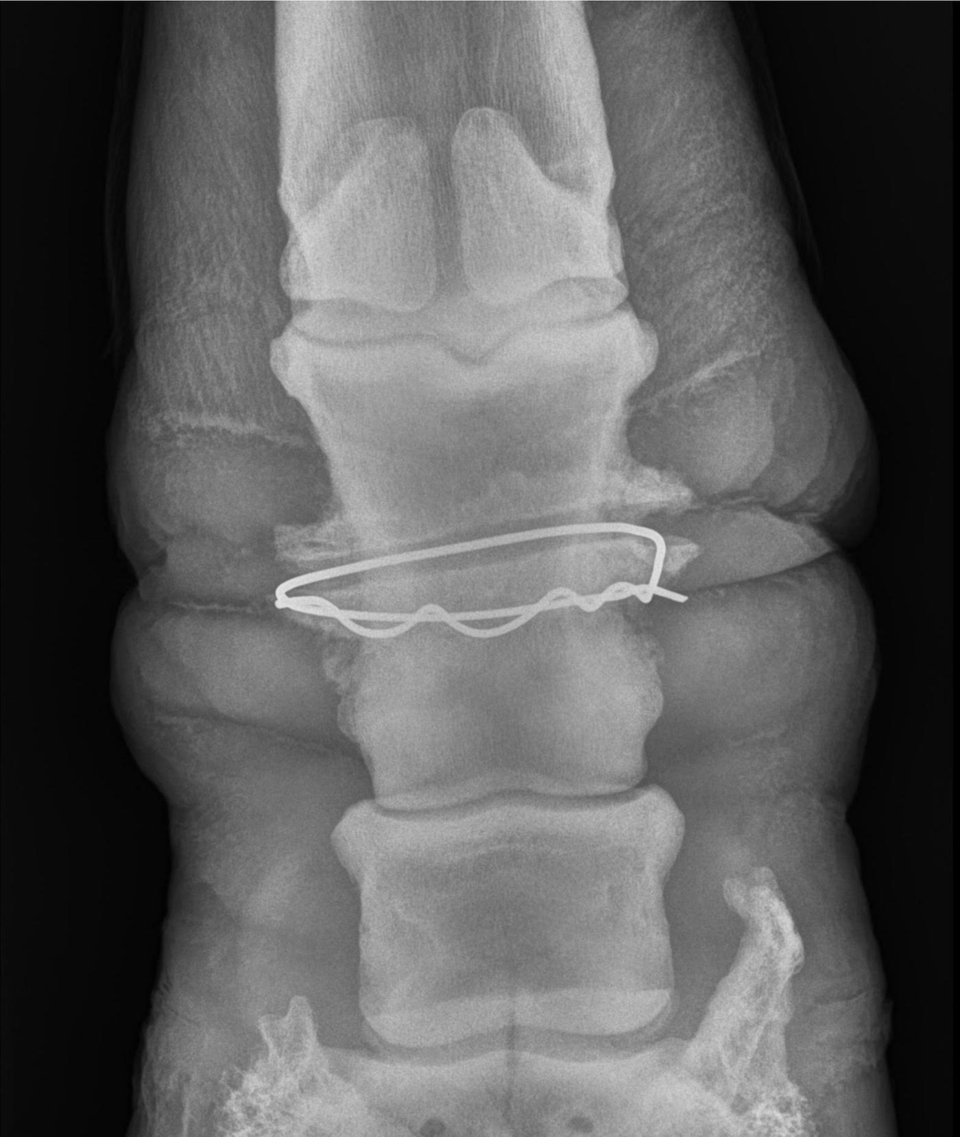 “The radiographs confirmed a metal object was circumferentially wrapped around the mid-pastern bone, embedded into the soft tissue and remodelled the bone itself,” Dr Chanutin said.