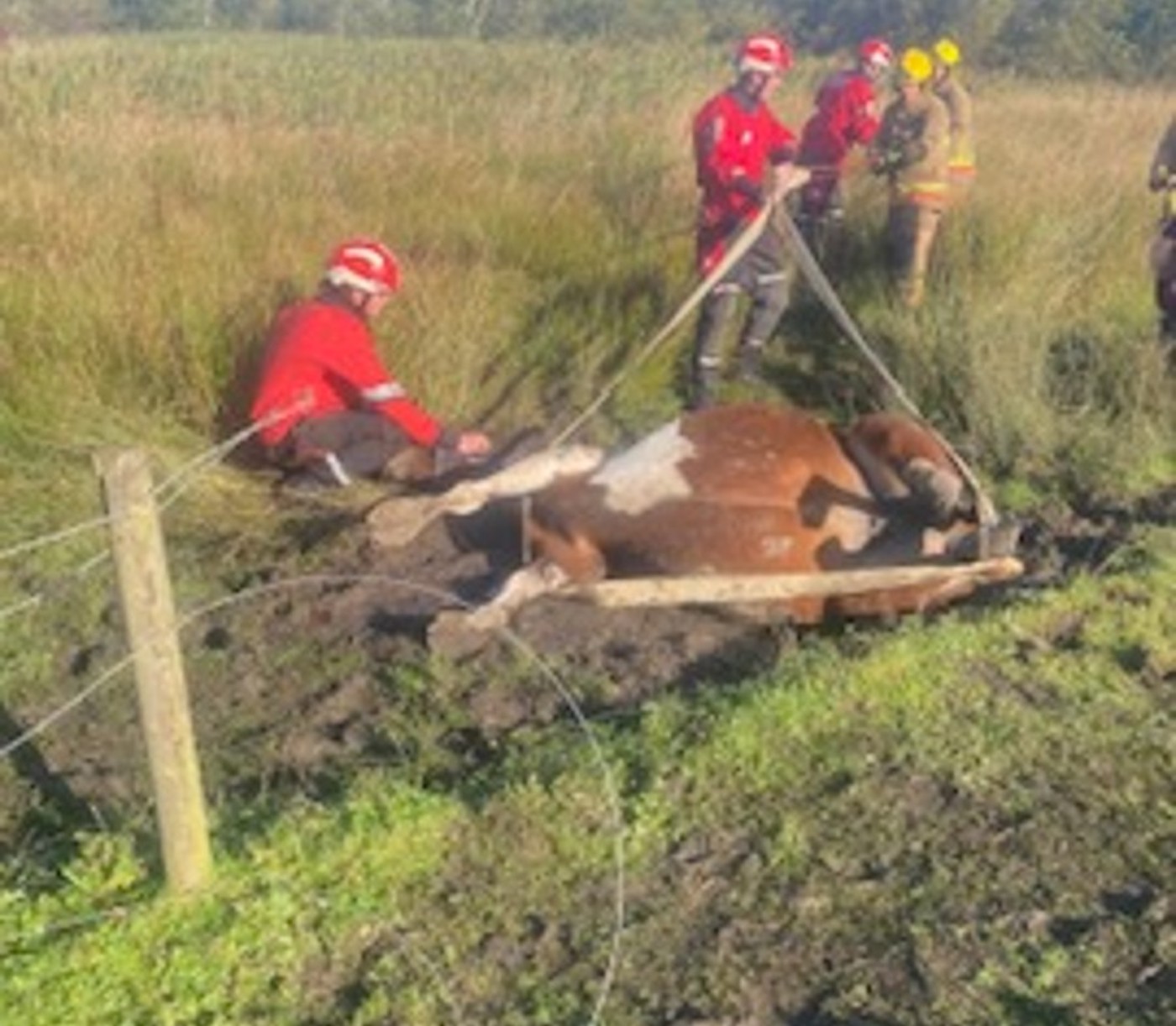 • The RSPCA and firefighters worked together to free a mare who was stuck in mud – and tangled in barbed wire.