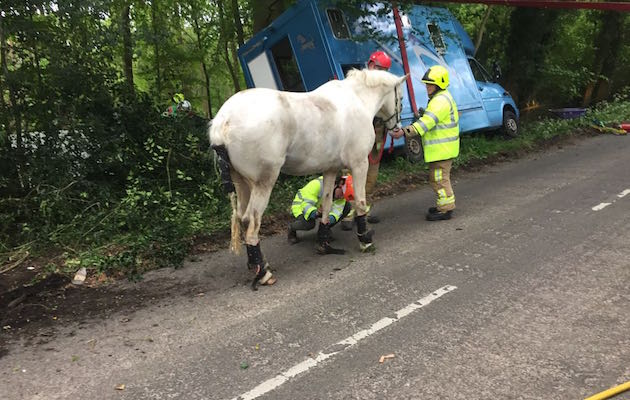 The driver’s door was stuck shut but passers-by climbed up to free Mary while her friend Lucy, who was driving her own horsebox just behind, arranged for the emergency services and a vet to be called.