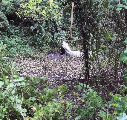 The pony had escaped and made his way into what had once been a pond, now a patch of soft mud, between two hedges.