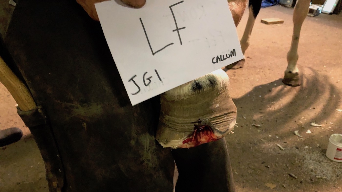 “His hooves were very long, misshapen and cracked. His [near fore] hoof was later x-rayed and a foot abscess was found, which was the cause of the acute lameness. All four feet had evidence that Leo was suffering from chronic laminitis.