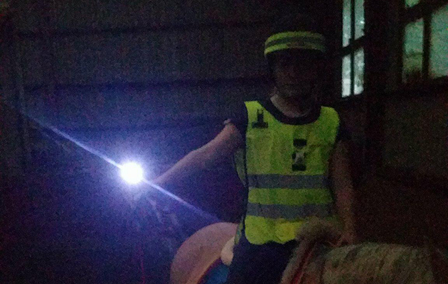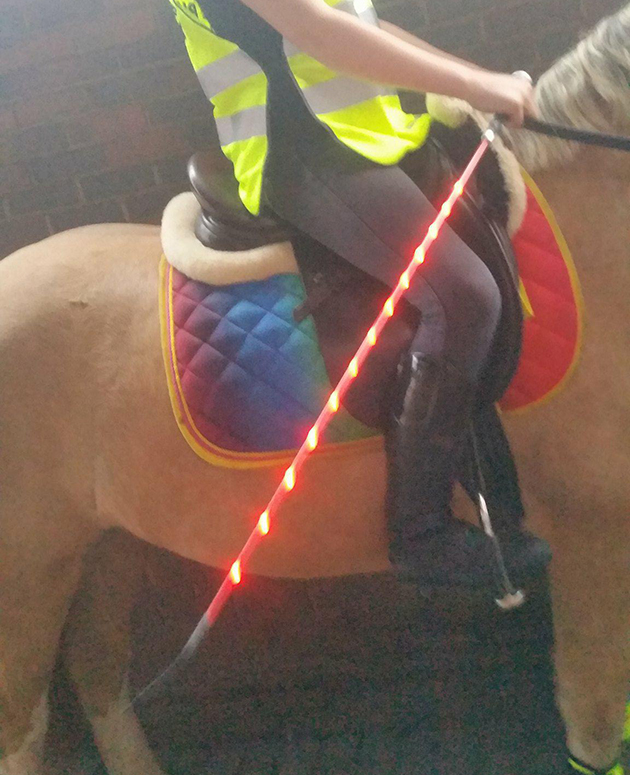 The LED lights are intended to highlight the width of the horse and rider while the torch is designed to alert oncoming traffic, as well as providing a useful tool for the yard.