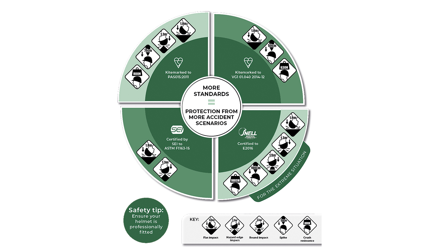 “VG1 requires the penetration spike to be dropped from 50cm, PAS015:2011 from 75cm and Snell E2016 from one metre, while ASTM F1163-15 does not include a penetration or crush test at all.”