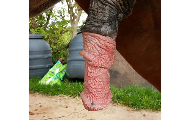 “Once the shaft of the penis is removed, the stump is bent backwards,” he explains. “We then open a hole at the back, between the horse’s hindlegs, and feed the stump through this to create a way for the horse to pee [pictured, below].