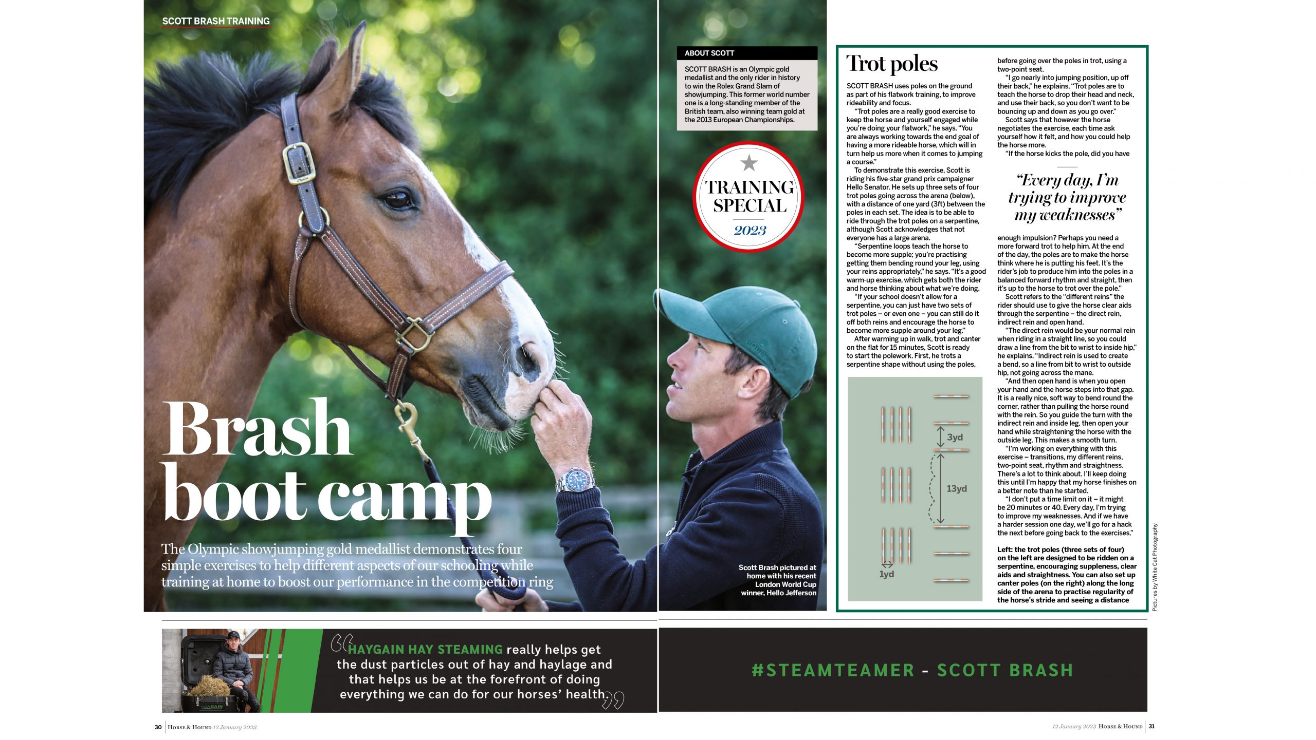 This week’s Horse & Hound, on sale from 12 January, features our training special, which includes a boot camp with Scott Brash where the Olympic gold medallist shares exercises he uses at home, plus we investigate what makes a good coach, and plenty more besides. Also in this week’s issue, you can read an interview with up-and-coming Welsh jump jockey Sean Bowen, take a look at a day in the life of a stunt rider and more. In the Vet Clinic pages, equine flu and vaccinations have been fast-moving topics over the past couple of years – we bring you what you need to know now. We have an exclusive columns from Carl Hester, Kim Bailey and Katie Jerram-Hunnable for dressage, racing and showing aficionados, while this week’s reports pages cover dressage, showjumping, racing and point-to-point action from across the UK for sport fans to enjoy. In this week’s hunting pages, we spend a day with the Pipewell Foot Beagles and Westerby Bassets, plus meet hunter of a lifetime Bob, the former point-to-pointer who’s clever on his feet on Exmoor, plus we go hunting in the Netherlands.