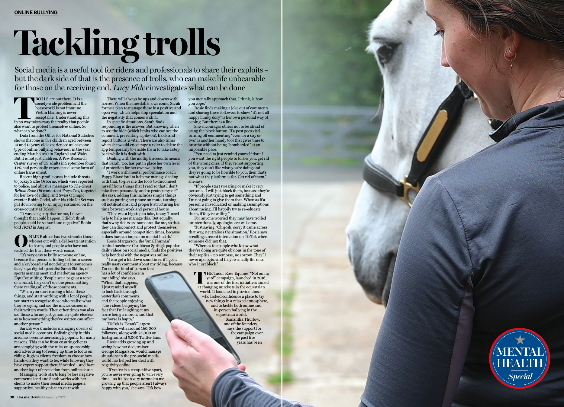 This week’s Horse & Hound magazine, on sale Thursday 13 January, contains our mental health focus, which includes a guide on how to cope when things turn sour on social media, the challenges of being a professional rider and more. This week’s exclusive H&H interview is with Felix Francis, the son of equestrian novellist, Dick, and we find out how to master canter pirouettes, while in Vet Clinic we take a look at how can you tell if your horse is a happy athlete. Our Nobby, the 14.3hh unlikely star who won Badminton and Olympic team gold features in our popular Legends of the Sport series. In addition, we bring you action from the world of showjumping, dressage, racing and point-to-pointing, plus there’s a range of hunting features to enjoy.