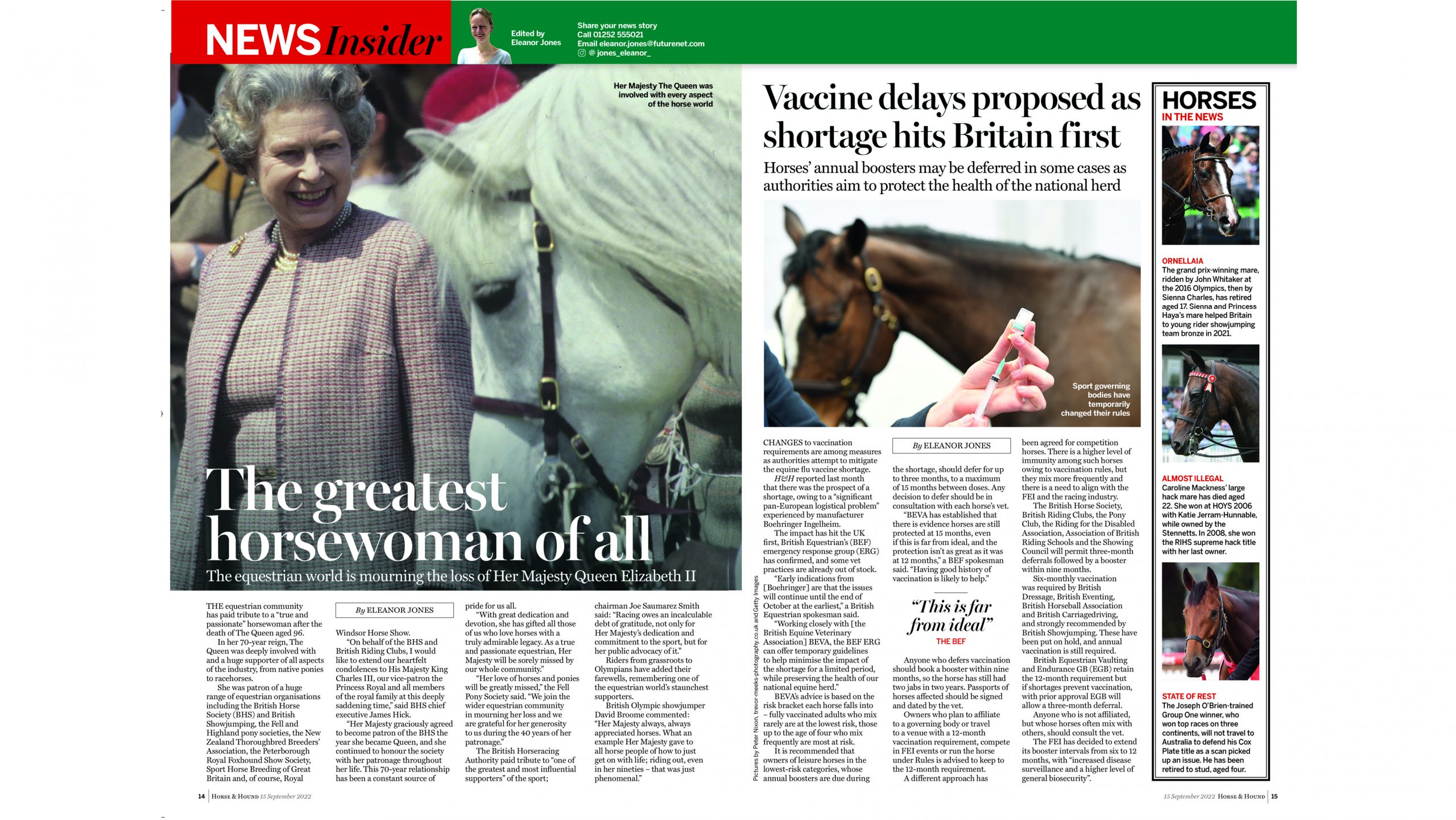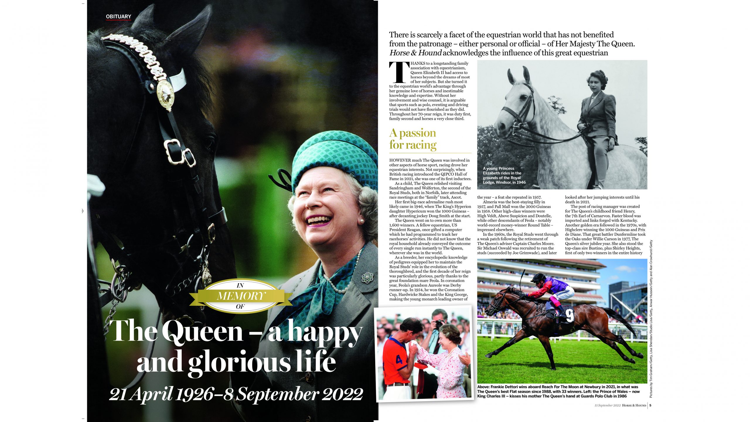 • In this week’s Horse & Hound magazine, on sale Thursday 15 September, we publish our own 10-page tribute to Her Majesty The Queen. There are also columns from Carl Hester and Julie Templeton for dressage and showing aficionados. This week’s interview is with Giuseppe della Chiesa, course-designer for this week’s eventing World Championships in Pratoni del Vivaro, Italy, while for our hunting fans, we look at the life of a Horse & Hound hunting correspondent. This week’s Vet Clinic looks at what causes swellings on horses’ legs and when should you worry about them, and we have reports from the world of eventing, dressage, showjumping, racing, showing and Riding Clubs as well.