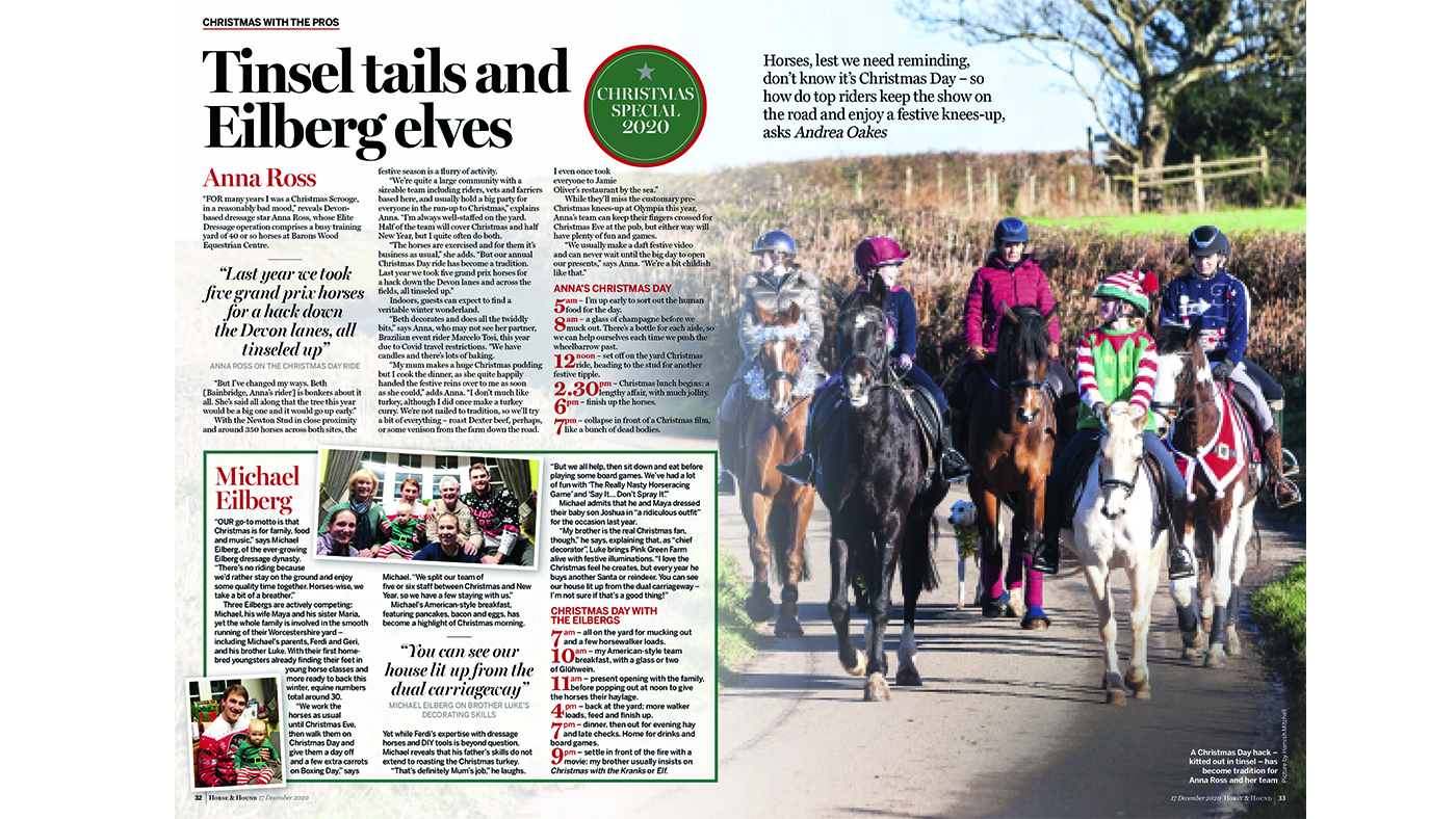 In this week’s Horse & Hound magazine, on sale Thursday, 17 December, don’t miss our Christmas special, complete with how some top riders celebrate, presents that people won’t forget and more. In this week’s “Vet clinic”, we explore the pros and cons of grazing horses alongside livestock, plus check out our nostalgic feature on the remarkable horse, who captured the hearts of many, Desert Orchid. We also find out the life lessons of show producer and showjumper Kirsty Aird and we focus on the Beaufort Hunt in our hunting pages. Plus, read reports from the Onley Grounds Winter Classic, top racing action from Cheltenham and much more.
