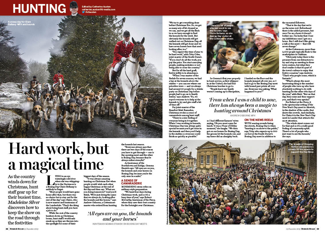 • In this week’s Horse & Hound magazine, out on Thursday 19 December 2019, don’t miss our ‘Christmas special’ issue including features on how riders juggle entertaining and equines, plus more. Test your equine health knowledge with our vet Christmas quiz, and in this week’s H&H interview we talk to all-round horseman and eventer Hayden Hankey. Check out our hunting content on keeping the show on the road over the festive period and more. We also have reports from across the disciplines, including racing action from Cheltenham, international showjumping and more.