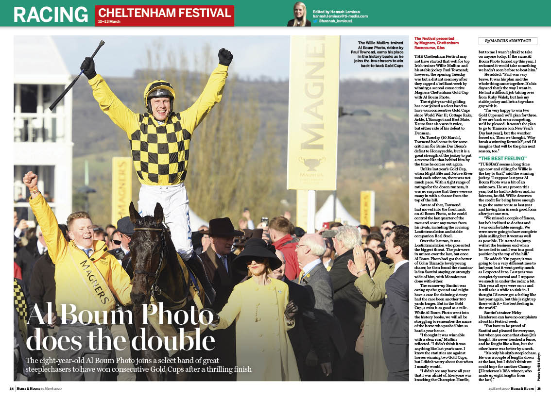 In this week’s Horse & Hound magazine, on sale Thursday, 19 March, don’t miss our full report from the Cheltenham Festival, including analysis, comment and pictures, plus read all the latest on the impact of coronavirus on the horse industry. Check out our “Hero to hero” feature with top riders Andrew Nicholson and Oliver Townend, and showing rider Simon Reynolds reveals his life lessons. Plus, in this week’s “Vet clinic” we explore horses’ gums and don’t miss our hunting content, including hunting with the Pau in France, meet the “quirky” Greyoss and more. We also have reports from across the disciplines, including point-to-pointing, dressage, eventing and more.