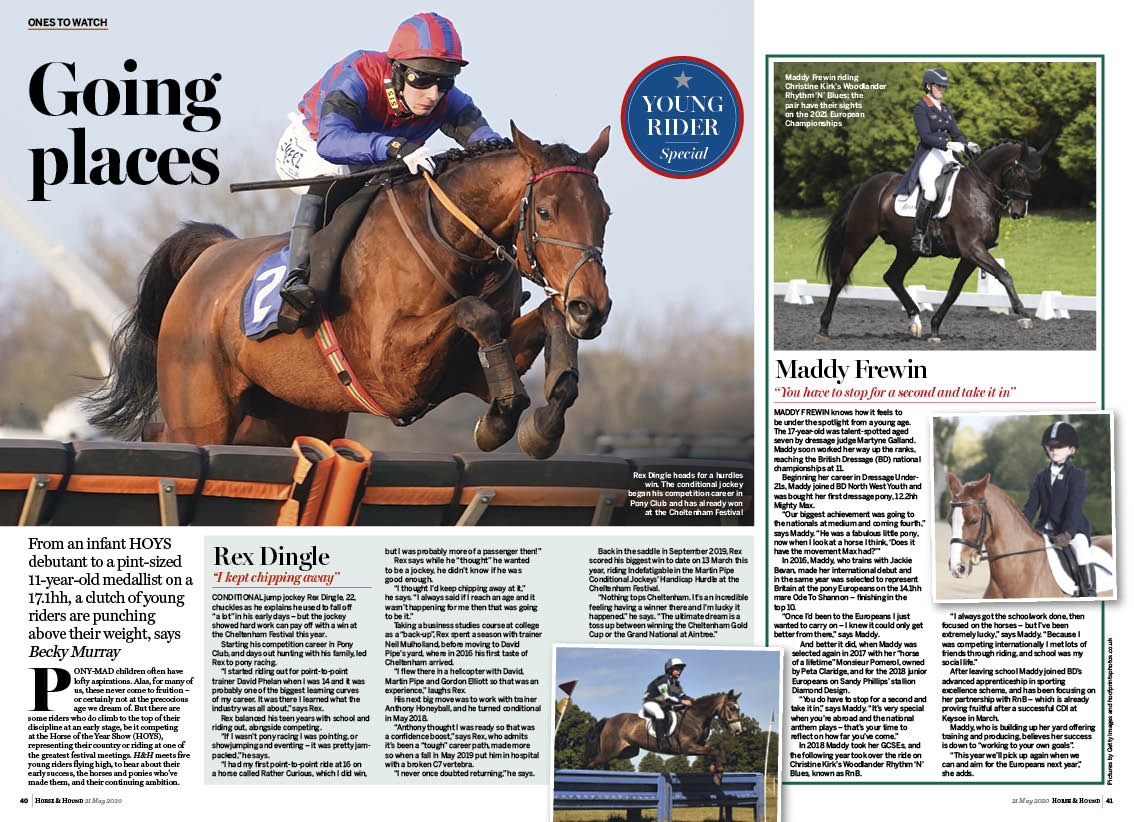 In this week’s Horse & Hound magazine, on sale Thursday, 21 May, read our “Young rider” special, including an interview with two young show producers with big ambitions, plus up-and-coming riders to watch and meet the budding superstars who have all come from non-horsey backgrounds and more. We also meet top dressage horse Super Nova II and in this week’s “Vet clinic” we offer tips for calming down an anxious horse. Improve your lockdown fitness with our feature on flexibility and increasing control in the hips and pelvis. Read our hunting content, including how the sport has evolved over the years, and enjoy a nostalgic tour back in time as we reflect on eventing great Mark Phillips’ career in “Legends of the sport”.