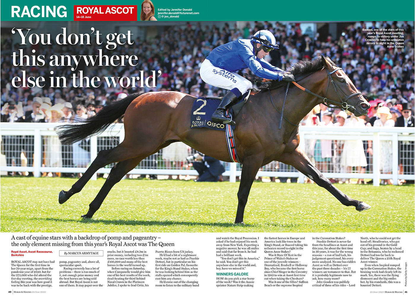 This week’s Horse & Hound magazine, on sale Thursday 23 June, features our Royal Ascot special report with a review of the action from the big races over the five-day meeting. We also bring you our tack special, which includes a look at life as a saddler and a guide on how to choose the right bit for your horse. Also inside, we have our regular favourites, including a Vet Clinic that looks at how kit can improve performance – and which products really work, plus a closer look at Ros Canter’s Badminton runner-up Lordships Graffalo, a selection of homes for sale for those with a big budget, an exclusive interview with 70-year-old endurance champion Lesley Caswell, as well as a full complement of competition reports from eventing to showjumping, showing to dressage, plus a hound show for readers to enjoy.