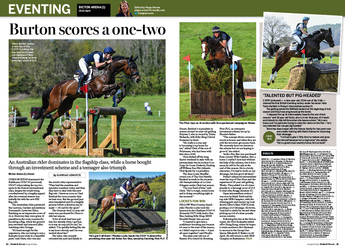 In this week’s Horse & Hound magazine, out on Thursday 25 April 2019, don’t miss our ‘Badminton preview’, including our course walk with world champion Ros Canter, analysis of this year’s dressage test, our must-have cross-country map and more. In this week’s ‘Vet clinic’ we explore electrolytes and in our H&H interview we talk to top event rider Ingrid Klimke. Check out reports from across the disciplines including eventing action from Bicton Arena, racing, point-to-pointing, team chasing and much more.