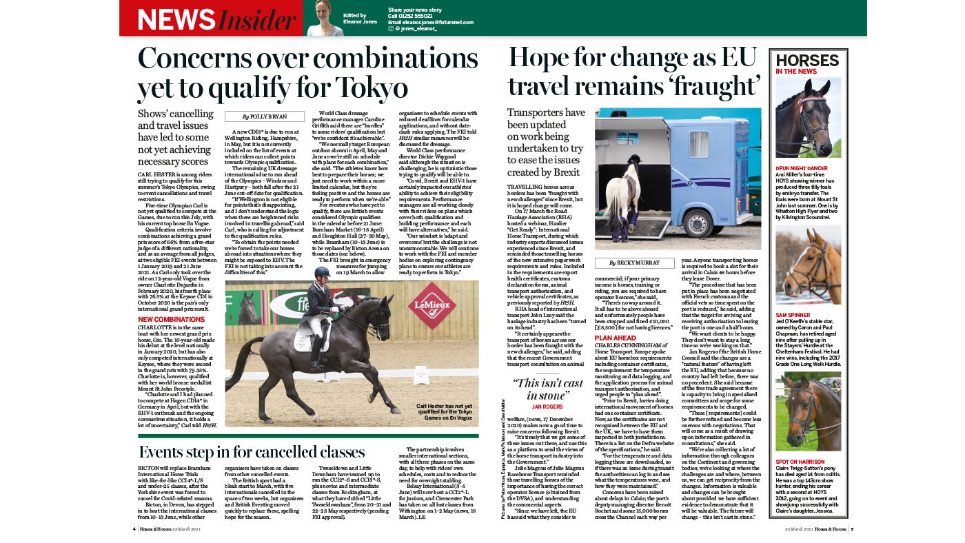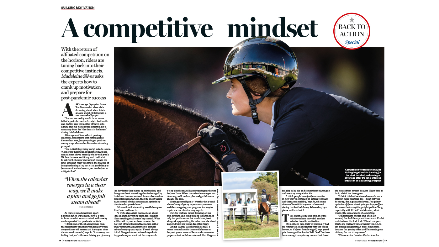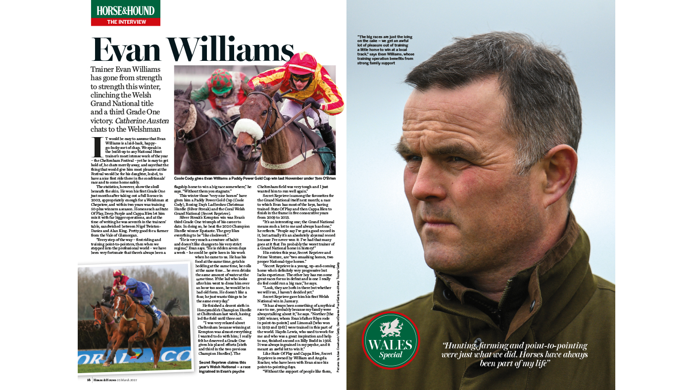 In this week’s Horse & Hound magazine, on sale Thursday, 25 March, we bring you the back to action special, which includes advice on how to adopt a competitive mindset, a look at rider nutrition and more. We also bring you the Welsh special, which includes an interview with National Hunt trainer Evan Williams and a look back on the career of Mister Softee, who won an individual Olympic medal with David Broome. You can also read veterinary advice on what’s involved in rehydrating a sick horse or restoring the body’s natural fluid balance and much more. We also have a comprehensive report from racing at Cheltenham and international showjumping from Florida.