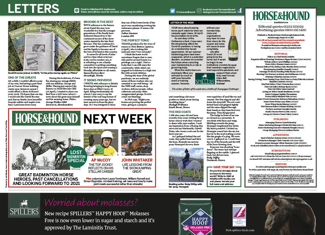In this week’s Horse & Hound magazine, on sale Thursday, 30 April, don’t miss our exciting new look content with great new series of features including “Legends of our sport”, plus horses we can’t wait to see after lockdown, a light-hearted Q&A and much more. Check out our guest edited content by Carl Hester and Charlotte Dujardin’s head groom Alan Davies, with features on transporting equine stars across the globe, the trials and tribulations of a groom, how the job has and hasn’t changed over the years, plus Valegro’s greatest moments. Plus we meet “classy” show horse Times Square III and don’t miss our mindest training series on developing “feel” through a visualisation process. Dressage rider Spencer Wilton reveals his life lessons, we take a nostalgic look back at revered showman David Tatlow’s career and read our hunting content, plus much more.