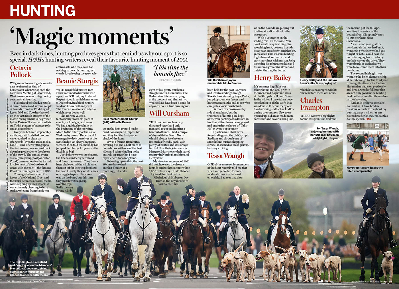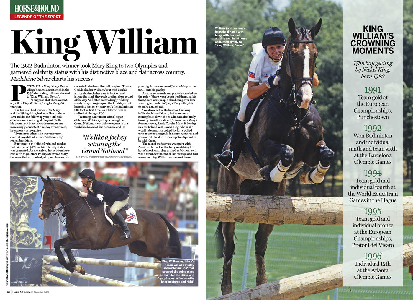 This week’s Horse & Hound magazine, on sale Thursday 30 December, is our annual reader issue when you – our wonderful readers – take centre stage with your special stories. This week’s exclusive H&H interview is with dressage rider Sadie Smith, and we turn the spotlight on Lottie Fry’s ride Dark Legend, while in Vet Clinic we discuss the benefits of keyhole surgery techniques in horses. Our cover star is no other than the legendary eventer King William, pictured by Trevor Meeks on his way to winning Badminton in 1992 with Mary King, who features in our popular Legends of the Sport series. In addition, we bring you action from the world of showjumping and dressage, plus a range of hunting features to enjoy.