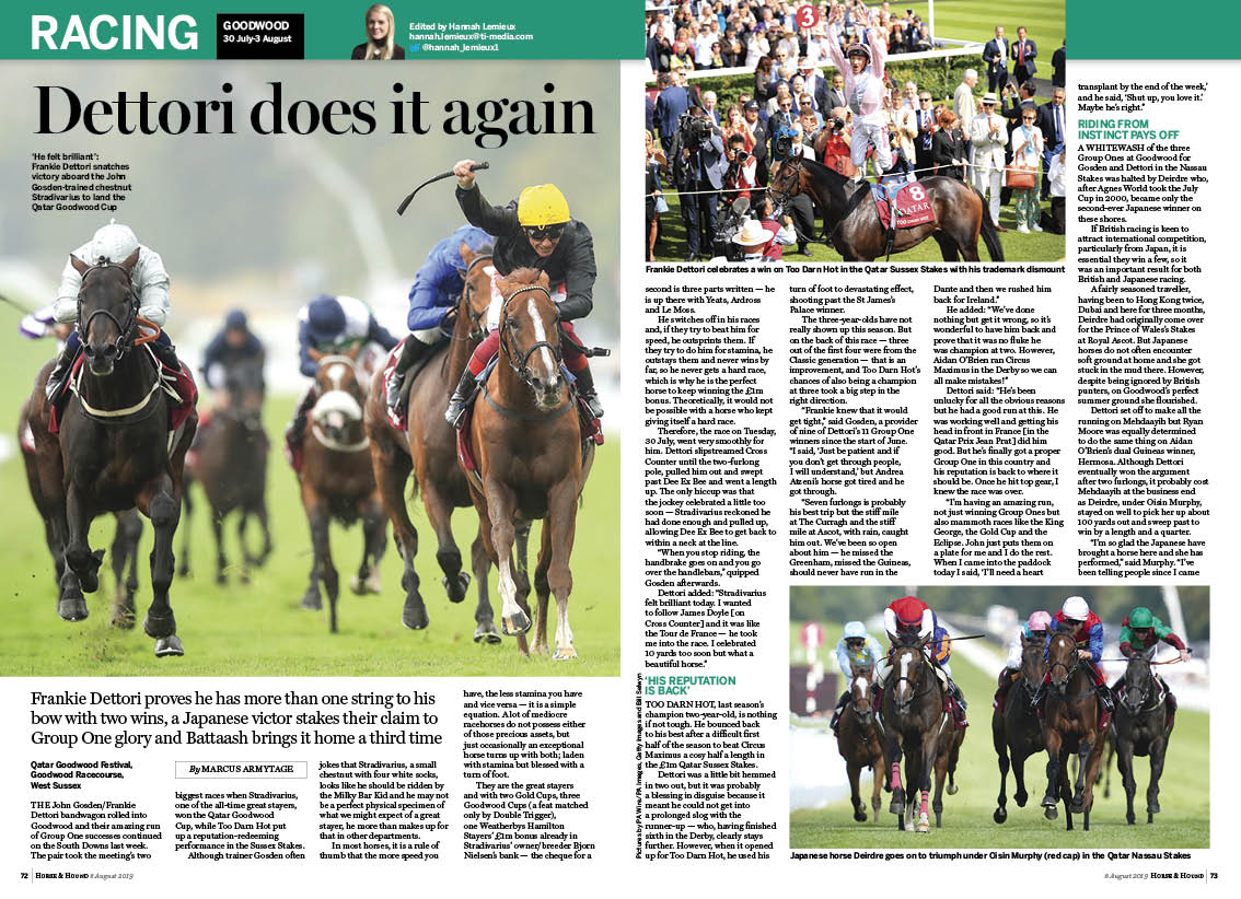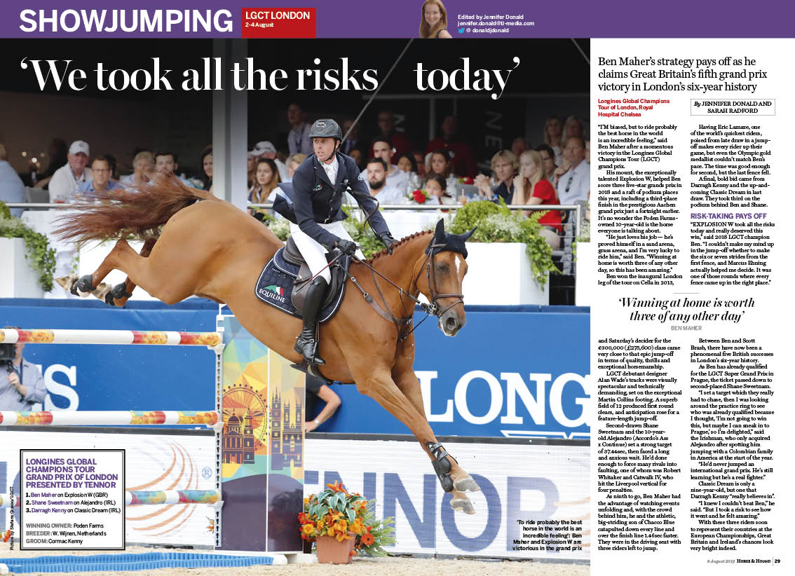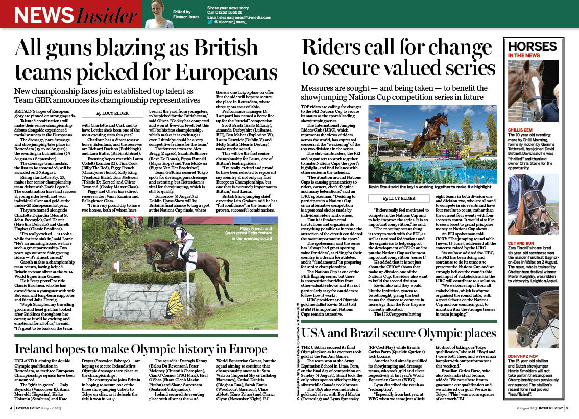 In this week’s Horse & Hound magazine, out on Thursday 8 August 2019, read all about the British success at the LGCT London and our big hope for an Olympic ticket in showjumping. Check out our full report from the Festival of British Eventing at Gatcombe, plus read Mark Todd’s exclusive comment on what eventing must do now to survive. In this week’s ‘Vet clinic’ we look into preparing an ex-racehorse for the show ring, and in H&H interview we talk to Irish team event rider Ciaran Glynn. Read reports from across the disciplineS, including racing action from “Glorious Goodwood”, showing and showjumping from the New Forest Show and much more.