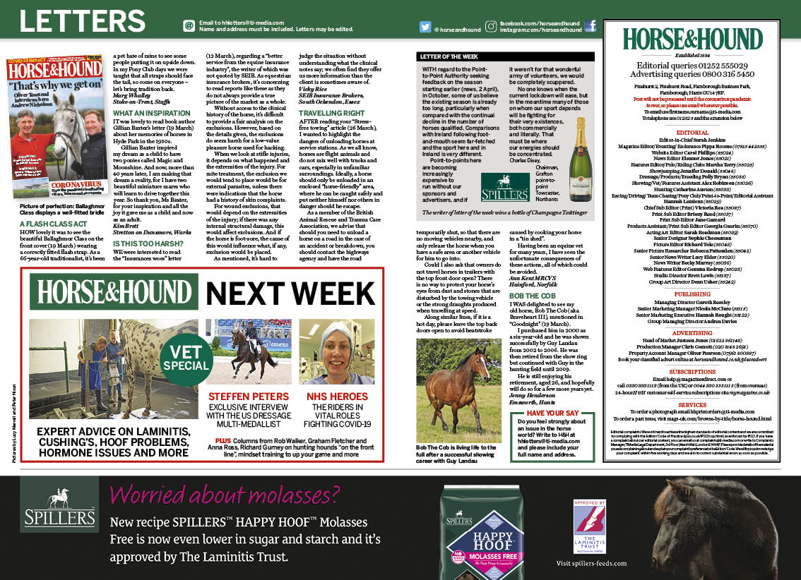 In this week’s Horse & Hound magazine, on sale Thursday, 9 April, don’t miss our “Training special” including features on a versatile approach to coaching riders, eventer Gemma Tattersall on perfecting your showjumping warm-up and more. Plus, read about how to have a winning mindset during these tough times, and check out our “Lost Grand National special” – we take a look back at the great races that did’t go to plan, talk to Dorset trainer Robert Walford and more. We also visit top dressage rider Laura Tomlinson at her new set-up and in this week’s “Vet clinic” we explore rectal palpation. In our hunting content, H&H’s photographers share their favourite snaps from the season.