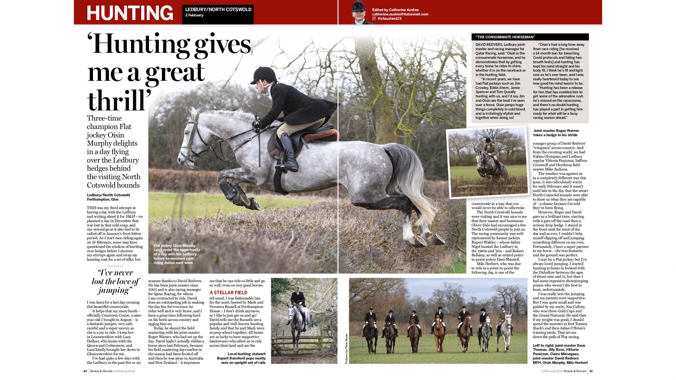 - ‘Hunting gives me a great thrill’: Oisin Murphy delights in a day flying over the Ledbury hedges behind the visiting North Cotswold hounds