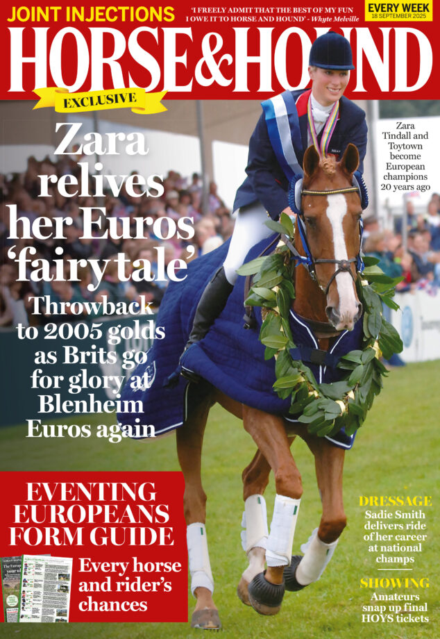 This week’s Horse & Hound, in shops from Thursday 18 September, contains our full European Eventing Championships form guide, with information on who is likely to make it to the podium at this week’s event. Also in this week’s issue, Zara Tindall relives her 2005 European golds and tells us all about how she won that year at Blenheim, while in the Vet Clinic, we find out about complications that can arise with joint injections. This week’s exclusive columns are from Spencer Wilton, Graham Fletcher and Katie Jerram-Hunnable for dressage, showjumping and showing fans. We also bring readers additional eventing, showjumping, dressage, showing and racing reports from around the UK. For hunting fans, we investigate whether there us time to hunt hounds and race-ride. There are also other plentiful articles for equestrian fans to enjoy – see a more detailed breakdown below.