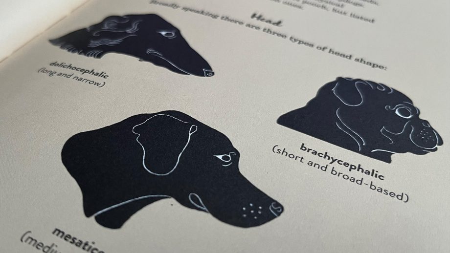 The first few pages of the book contain information such as “From wolf to weimaraner” a foreword about the history of dogs. This is followed by a few pages covering groups, details and characteristics, accompanied by informative illustrations. While it doesn’t cover all of the 350 dog breeds, each of the 101 pages has a concise paragraph about the general assumptions of each breed, with a large cartoon (but tasteful) illustration in a linocut style.
