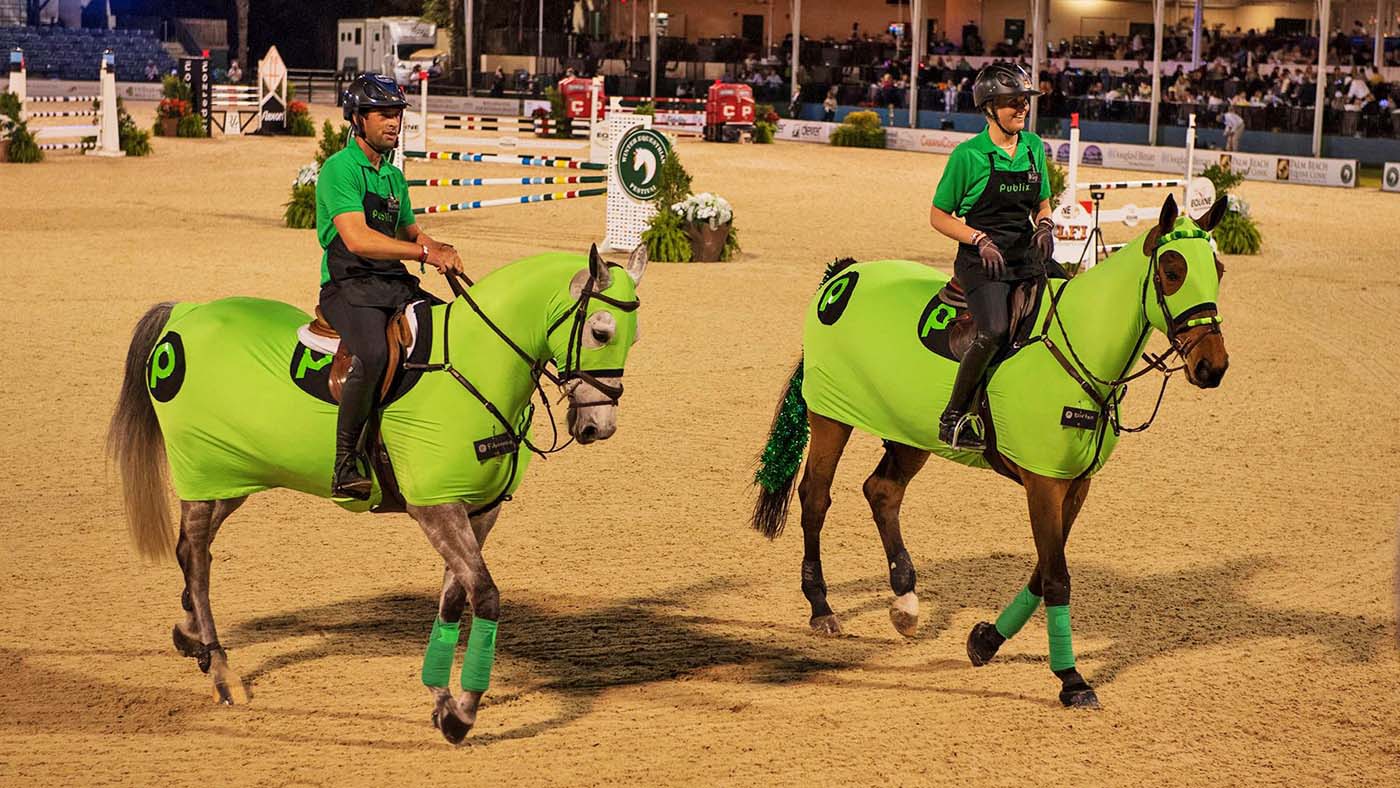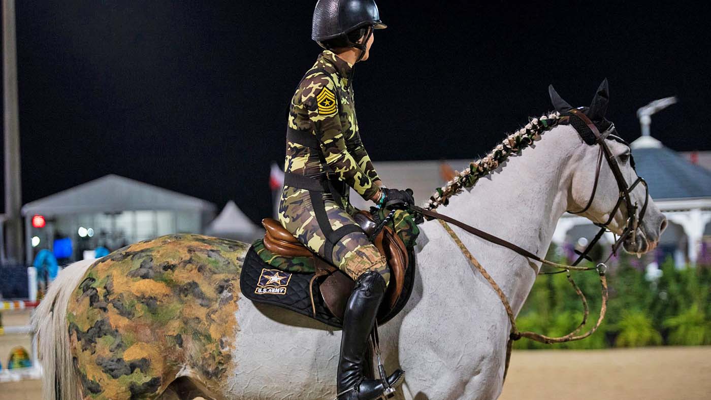 The winning team of Lindsey Tomeu (Bonapart), Ashley Vogel (Lucy In The Sky) and Shane Sweetnam (Heart On Fire) sponsored by Spy Coast and Preston and Diamante Dressage, came in the ring donned in fatigues to represent the U.S. Army as their heroes, finishing in a time of 91.66sec. Their assigned charity was YWCA of Palm Beach County, earning them the top prize of $100,000.