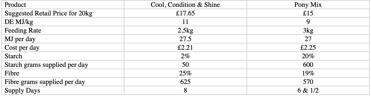 The table below gives an example of a fibre-based conditioning feed compared to a lower cost traditional coarse mix. Note that the starch level is far lower in the fibre-based feed, so not only is it more conditioning but it is also less likely to create fizzy behaviour.