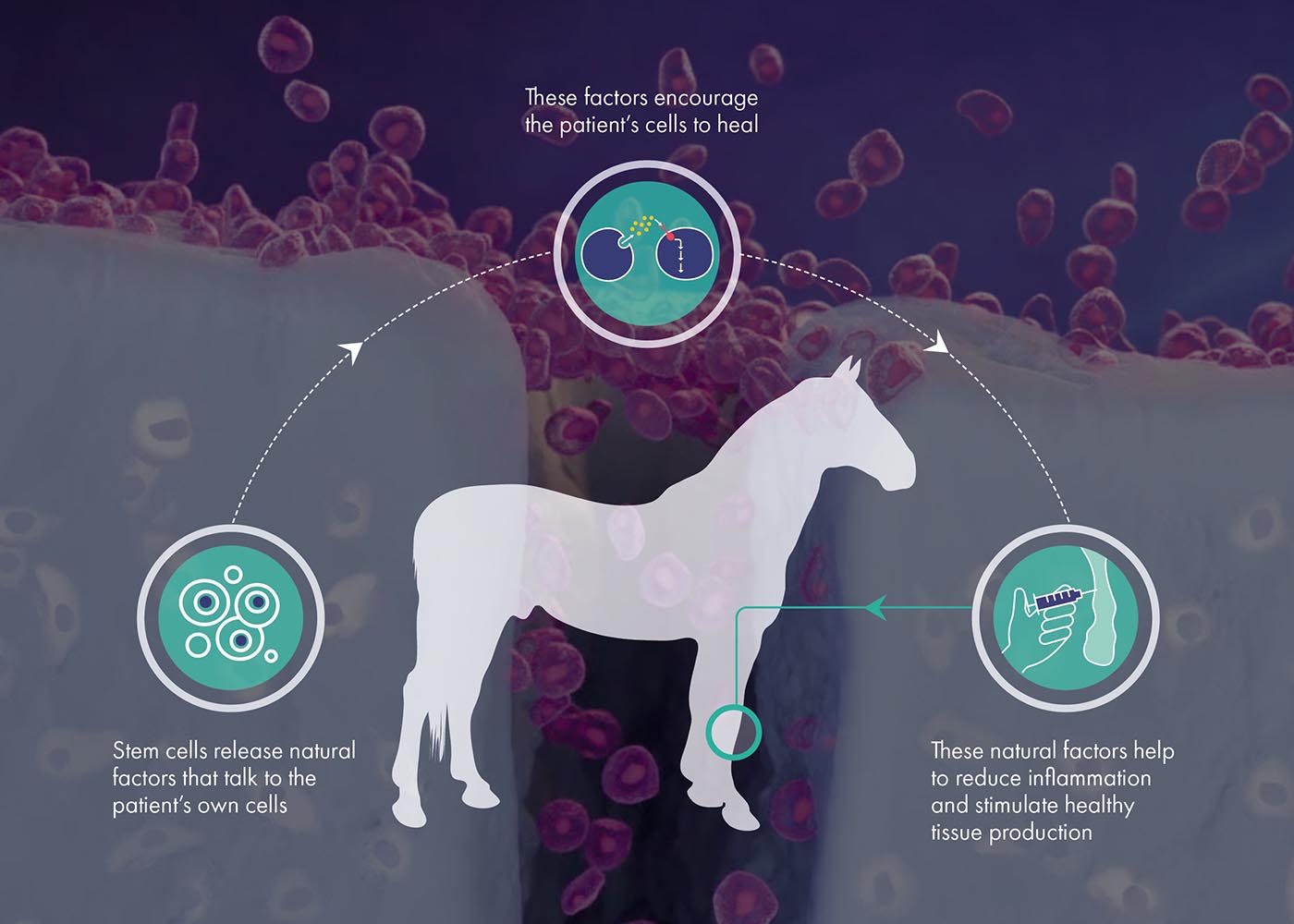 Stem cell therapy is different. Stem cells treat lameness and inflammation by releasing natural anti-inflammatory mediators into the joint2. But stem cells are also doing something else.