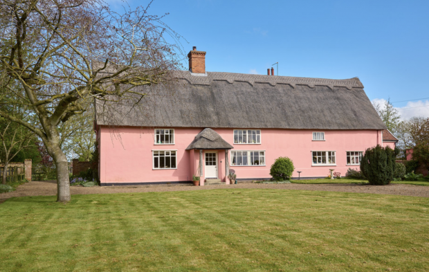 Pretty in pink – check out this thatched farmhouse, complete with stables, arena, grazing and more